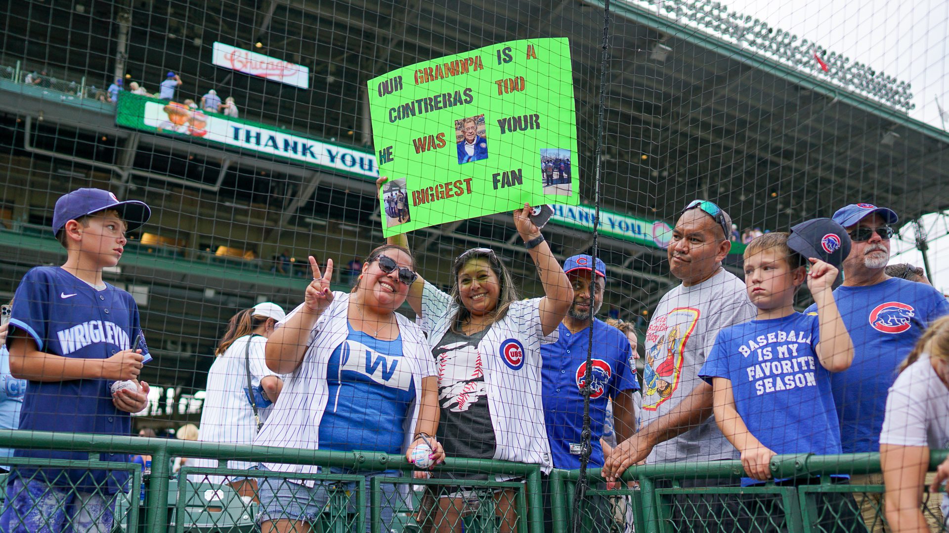 During an inning break in Saturday’s game at Wrigley Field, fans Andrea and Crystal Gonzalez got the attention of Cubs catcher Willson Contreras. Adorned with photos, they held a customized poster that read: “Our Grandpa is a Contreras too. He was your biggest fan.”